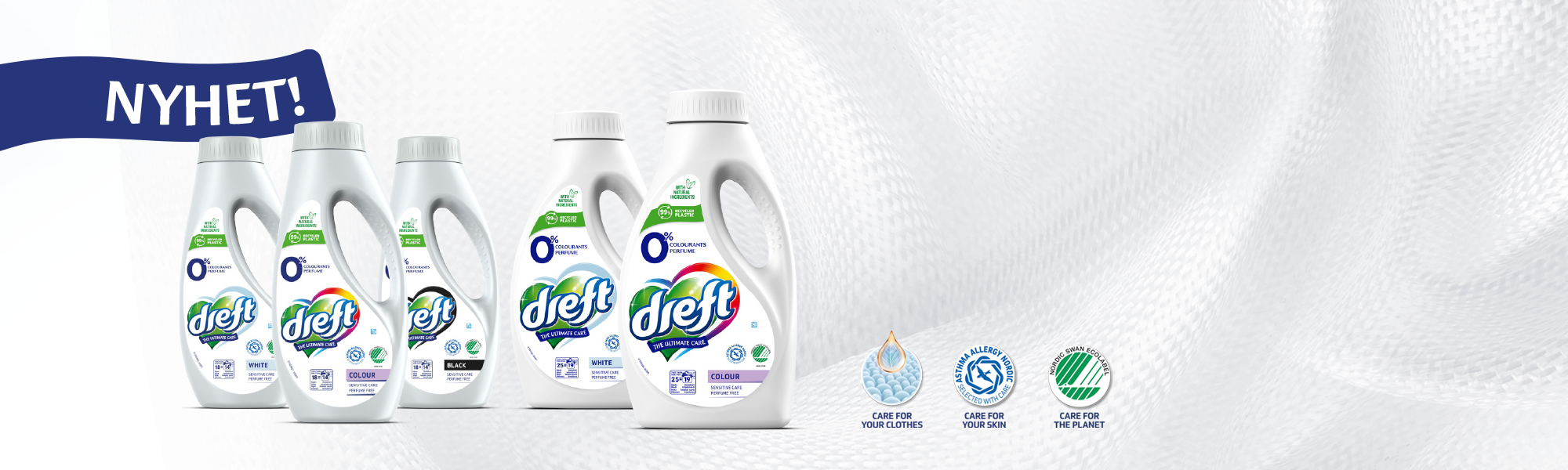 Nu lanserar vi på Arvid Nordquist, ihop med Blue Sun, tvättmedlet Dreft i Sverige. Tvättmedlet kommer i en serie om flytande medel för vit, färgad och svart tvätt. Vi lanserar två olika storlekar, 728ml och 1000ml. Håll utkik i din butik och testa. Let's Care!